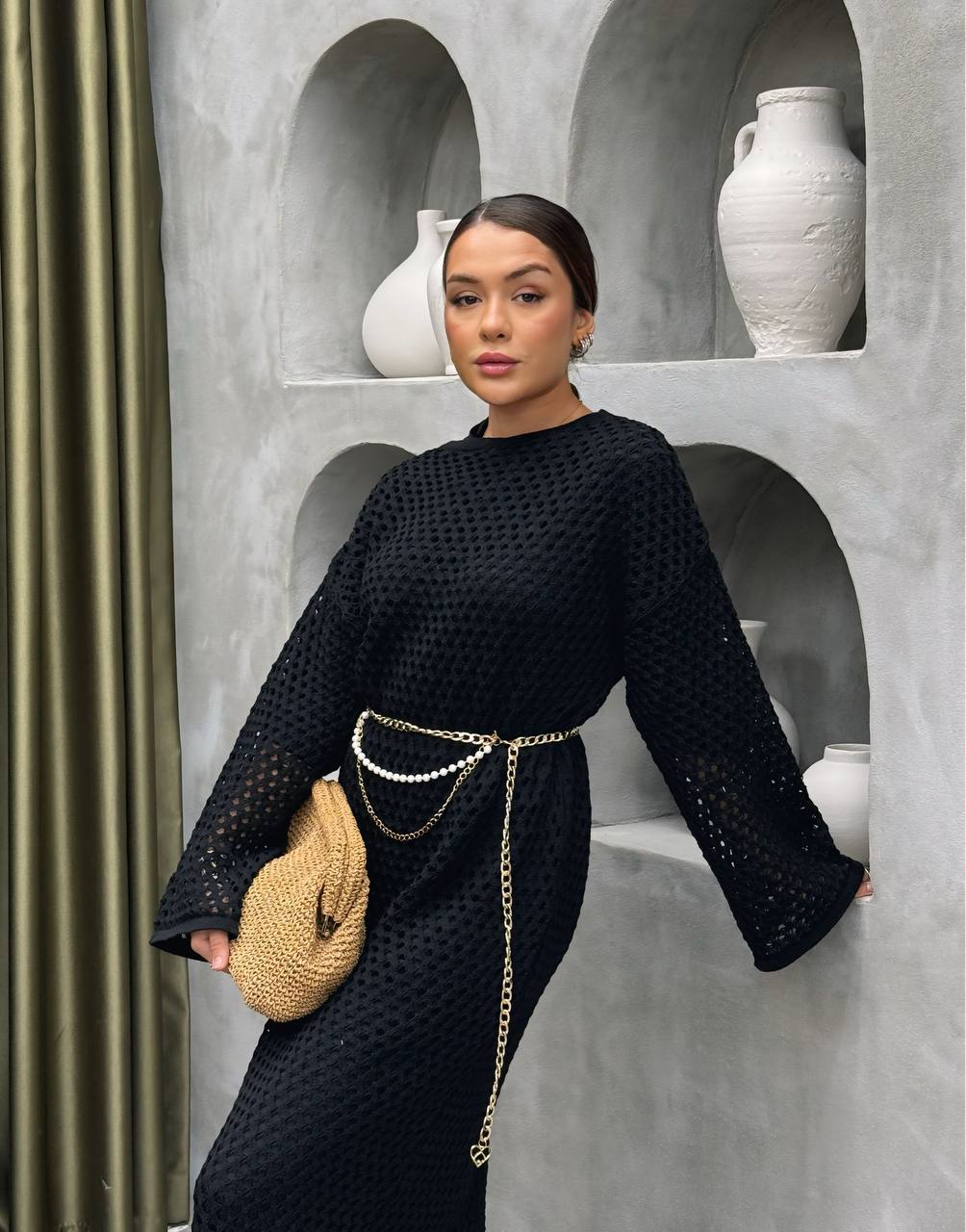 Elegant Textured Dress with Belt(3pcs) فستان أنيق بنقشة مميزة وحزام