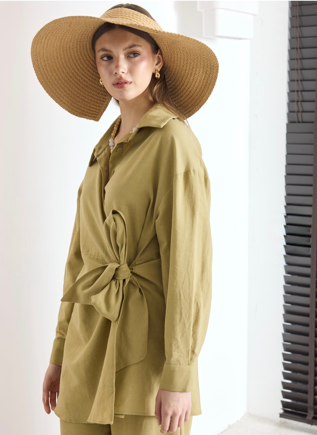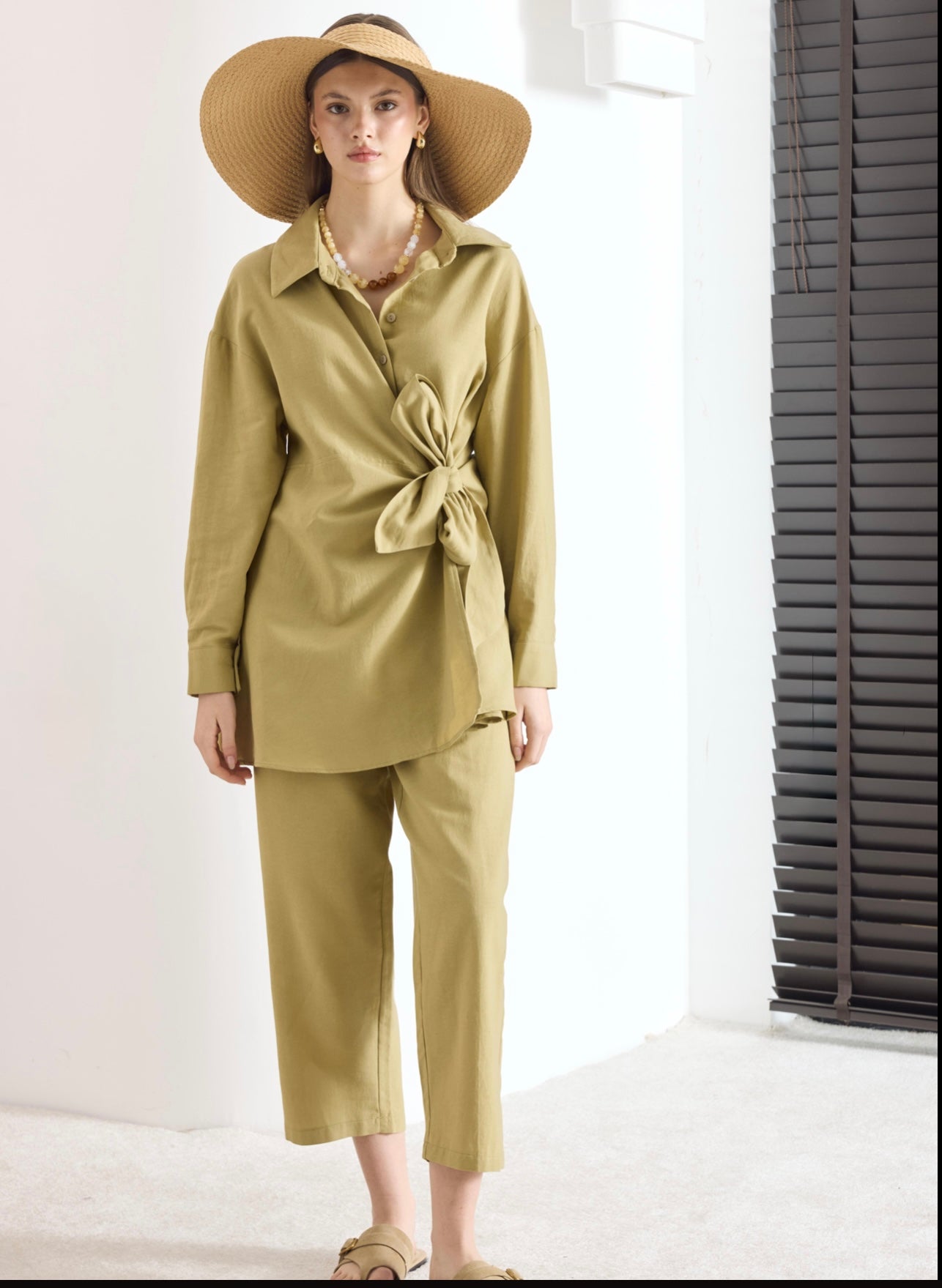 Soft and breathable two-piece set with a unique side knot detail. The blouse offers full coverage with a flowy cut, while the pants feature an elastic waistband for comfortable everyday wear. The model is tall, but the set is designed to flatter girls up to 168 cm in height.