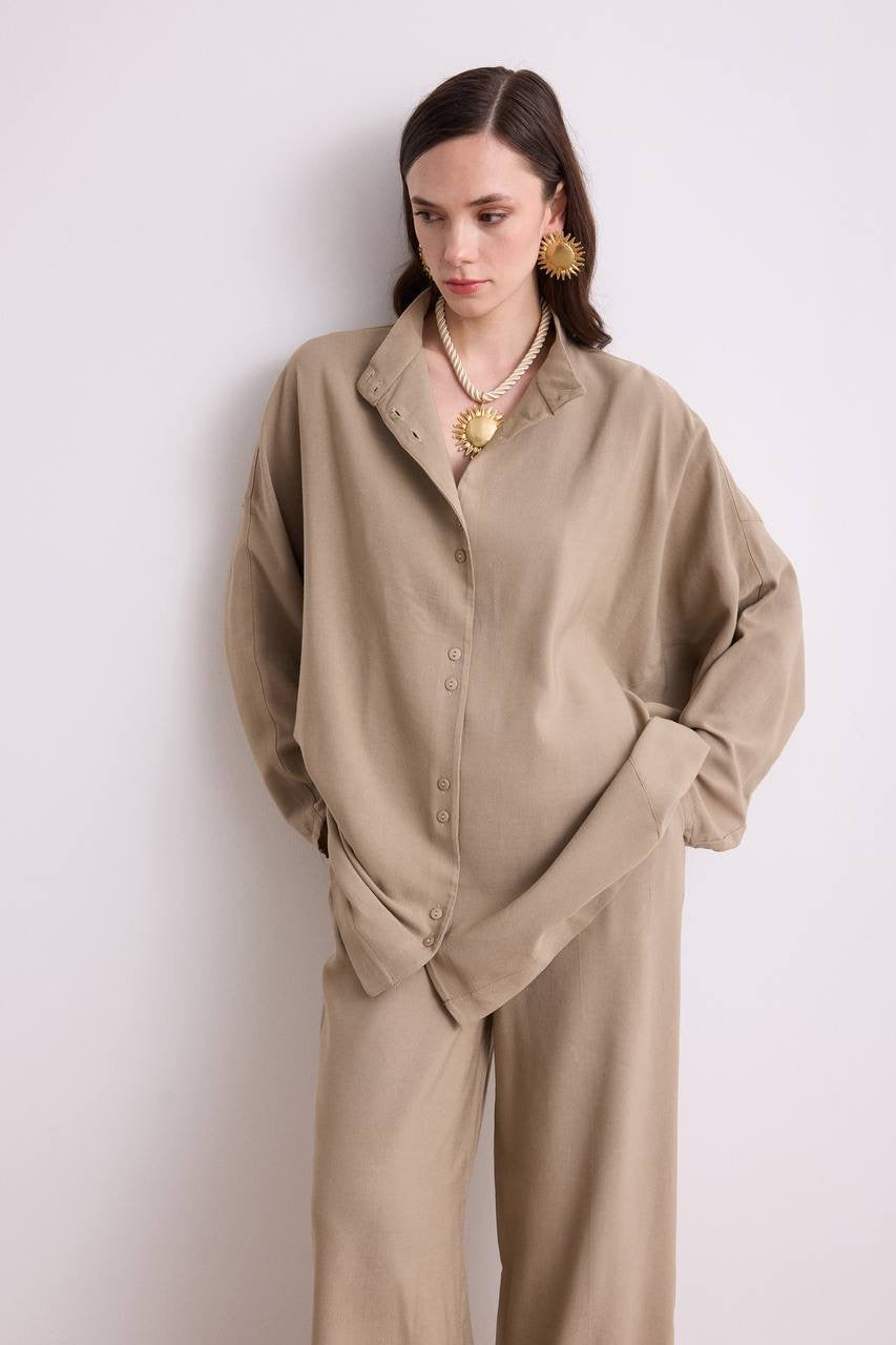 إطلالة أنثوية ناعمة بلون عنّابي أنيق، تتكوّن من بلوزة بأزرار أمامية ورباط خصر ناعم لإبراز القوام، مع بنطال واسع بنفس اللون والخامة يمنح راحة وأناقة التصميم بسيط وراقٍ، مثالي للمناسبات النهارية أو الرسمية،