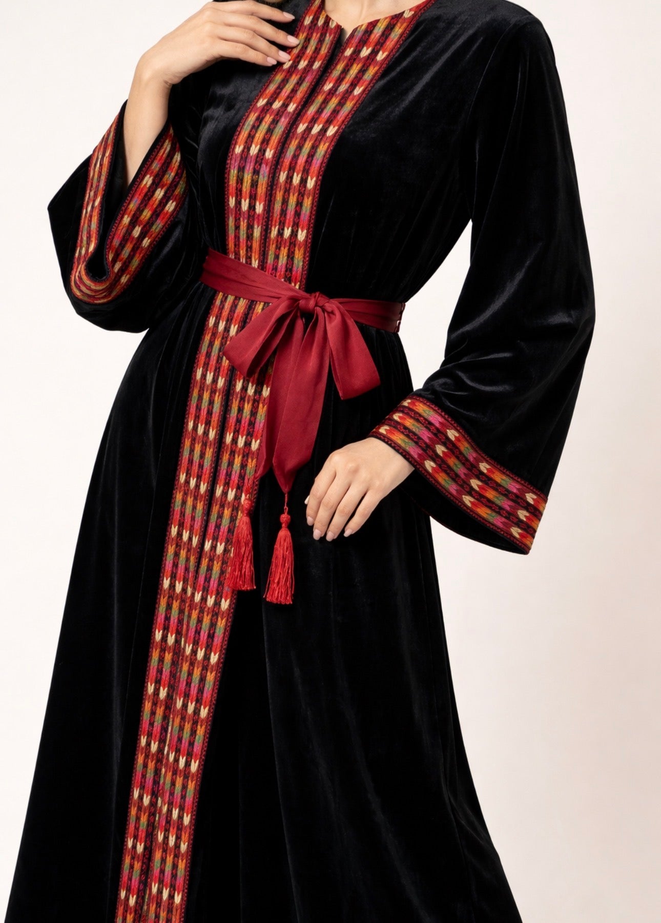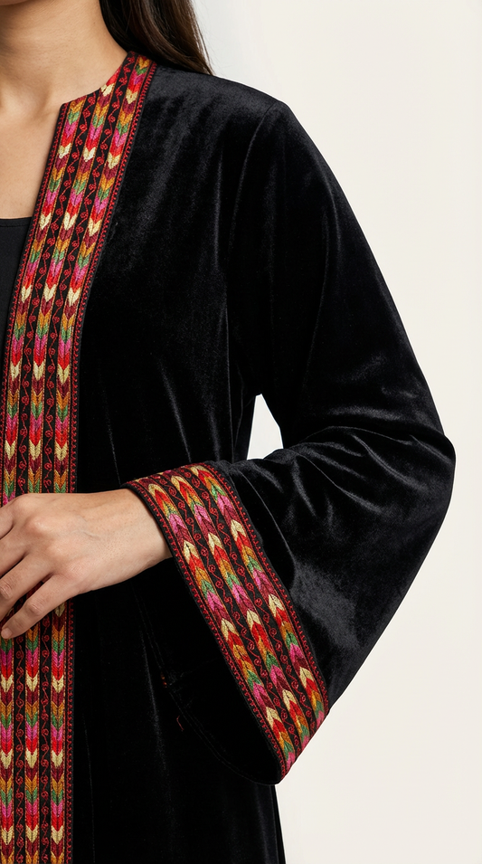 Luxury Velvet Open Bisht with Heritage Embroidery & Red Sash