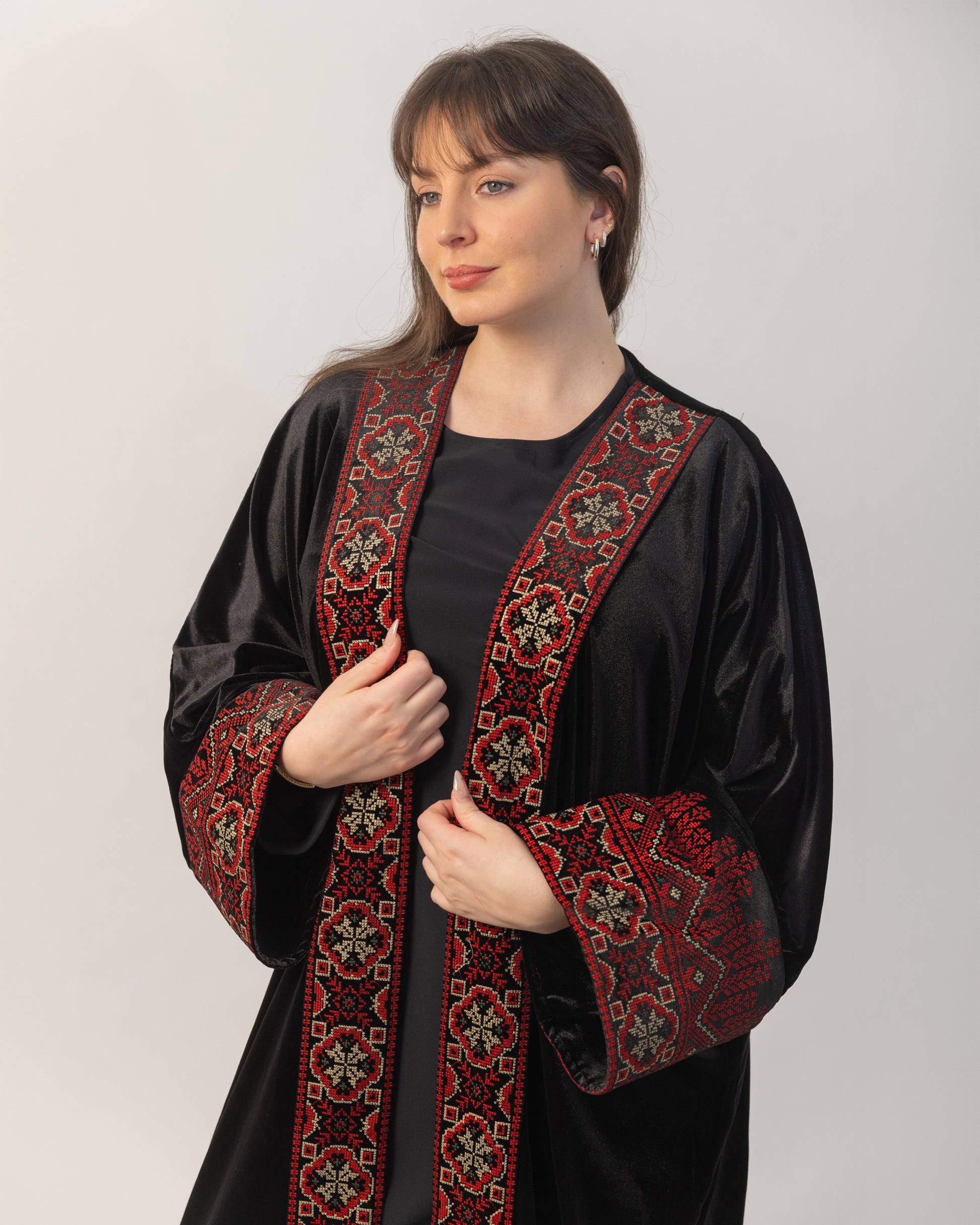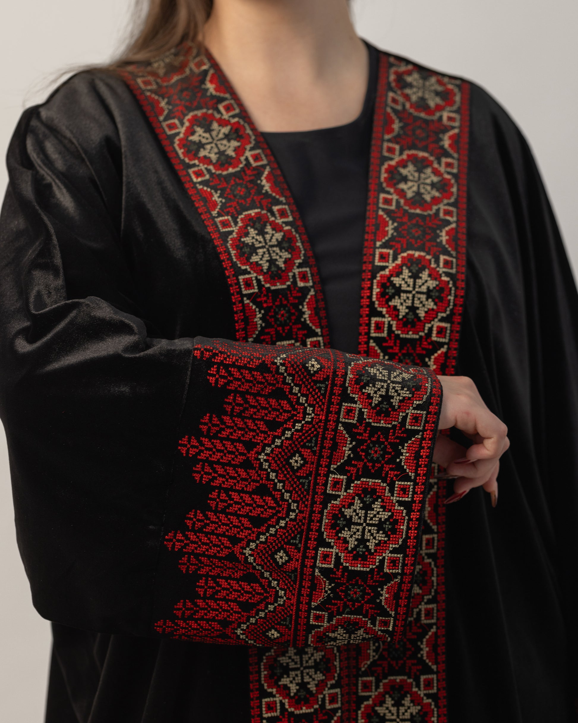 A graceful abaya inspired by the beauty of Nisreen blossoms, featuring exquisite floral embroidery that adds a refined traditional touch. A perfect choice for a look that blends heritage and elegance.