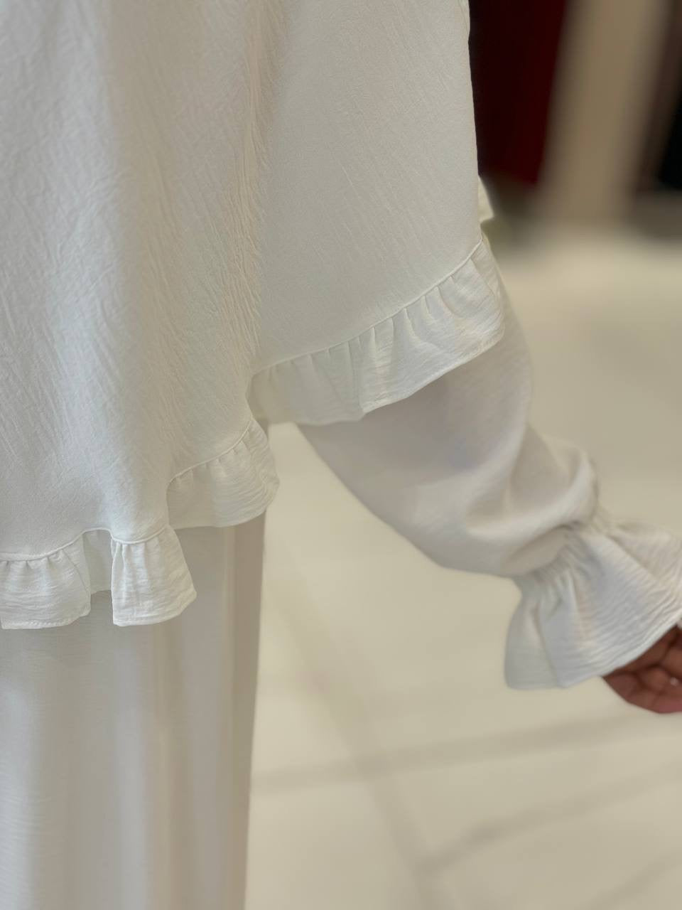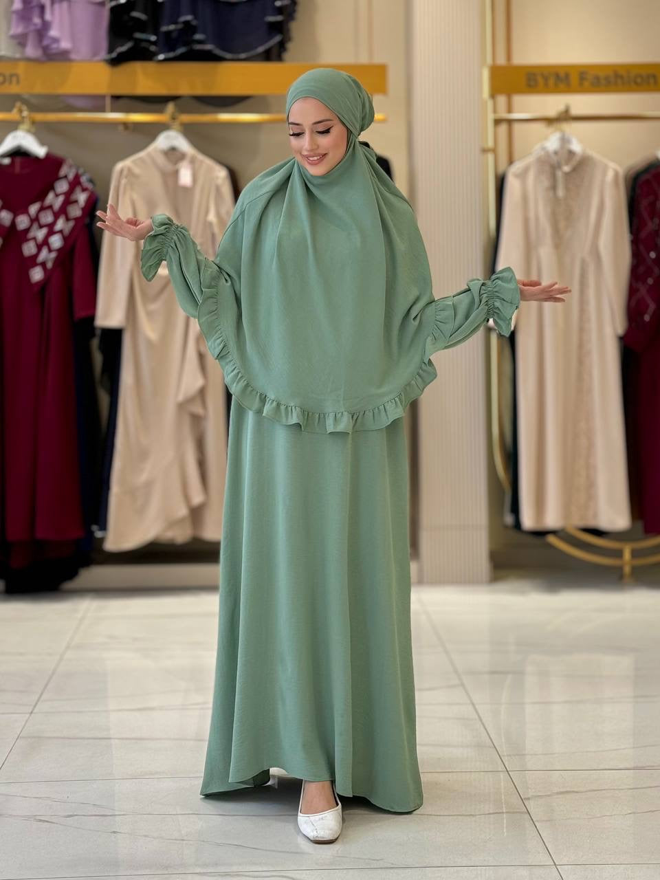 تصميم عملي وأنيق مكون من قطعتين، فستان واسع مع خمار طويل بلون أخضر هادئ. يتميز بقصة مريحة تضمن سهولة الحركة مع لمسات أنثوية ناعمة مثل الكشكش الخفيف على الأكمام.