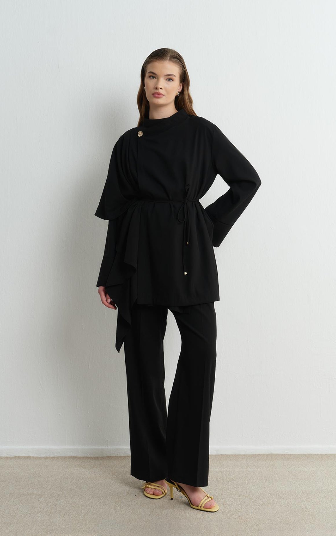 طقم رسمي أنيق مكوّن من قطعتين مع كاب جانبي Bayan’s Set | وزر ذهبي فاخر(LastPc)