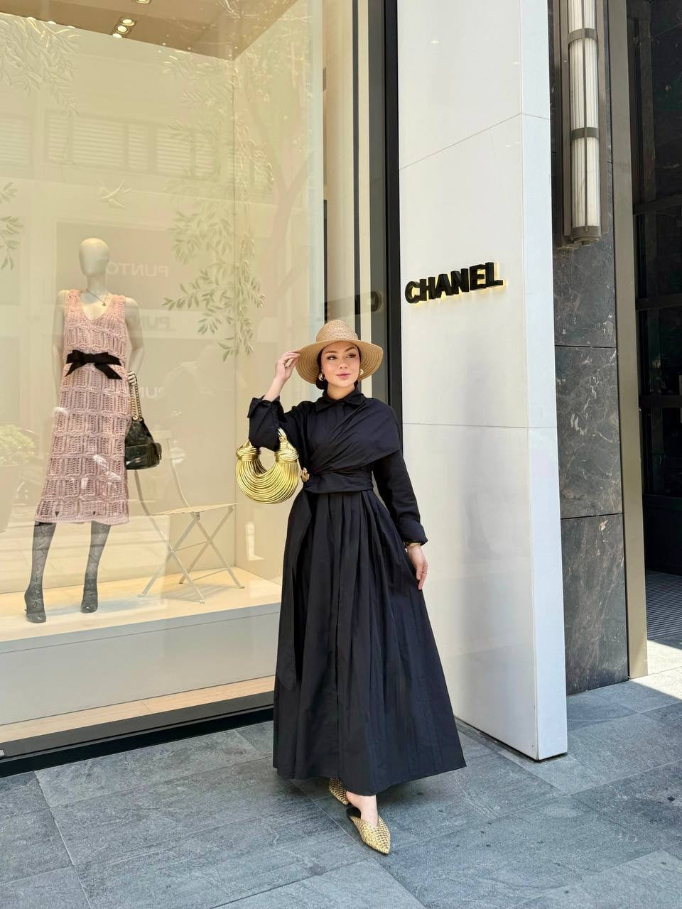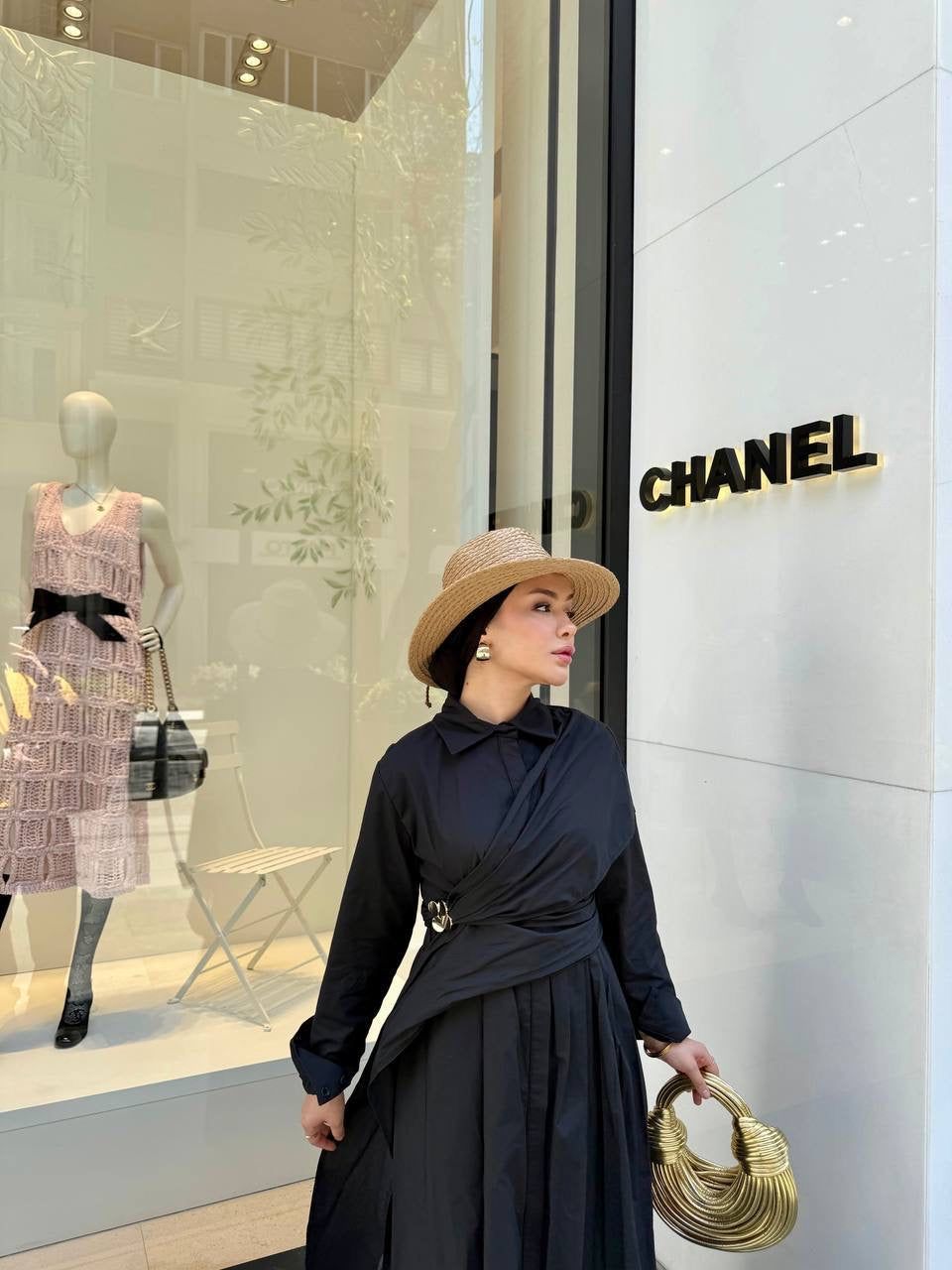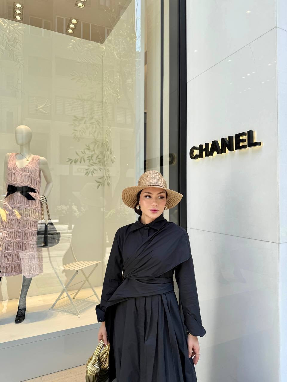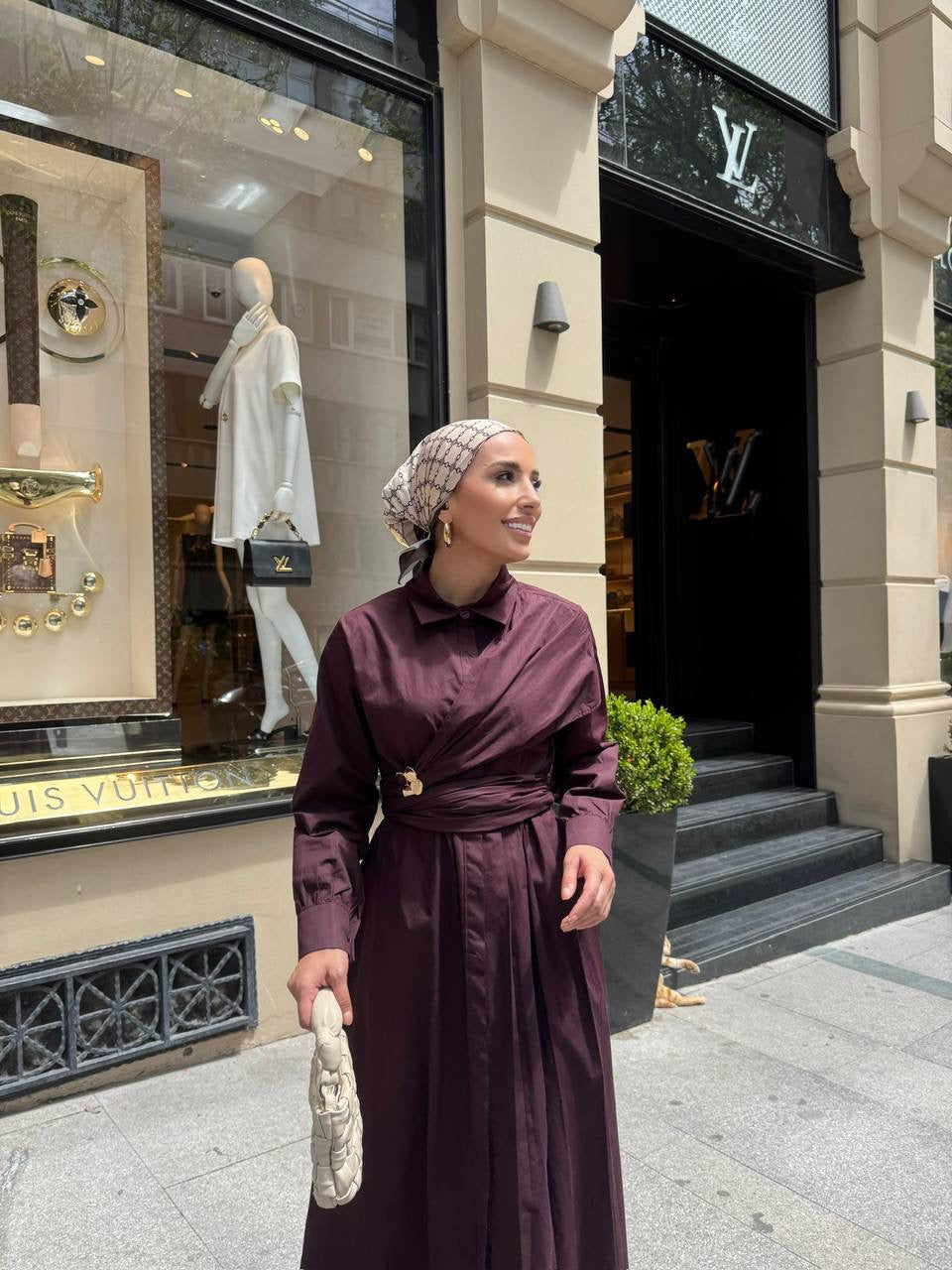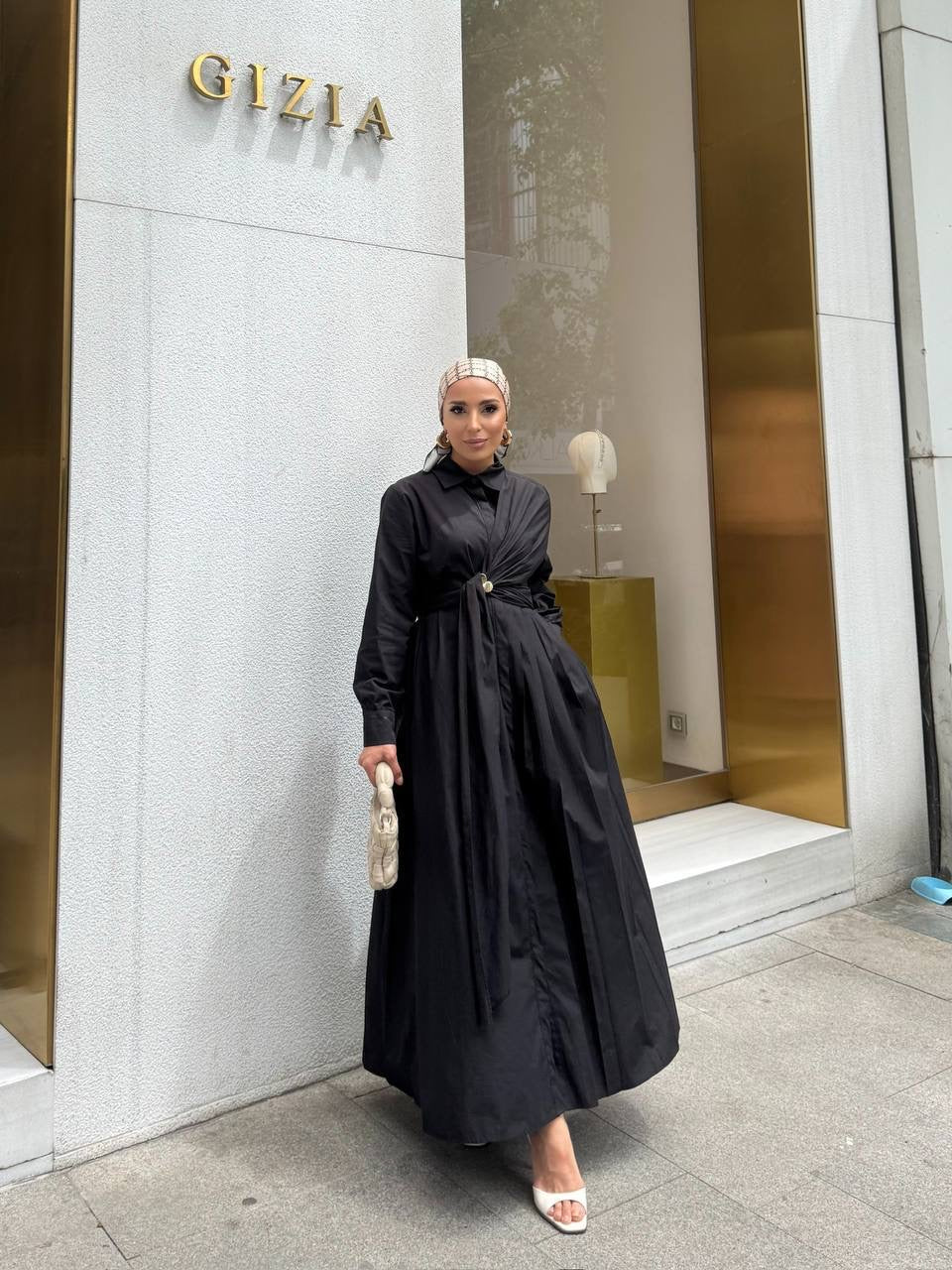 يتميز هذا الفستان بقماش بوبلين أنيق ولفة قماش متقاطعة، تزينها قطعة معدنية على شكل وردة تشبك الحزام وتحدد الخصر بانسيابية راقية.